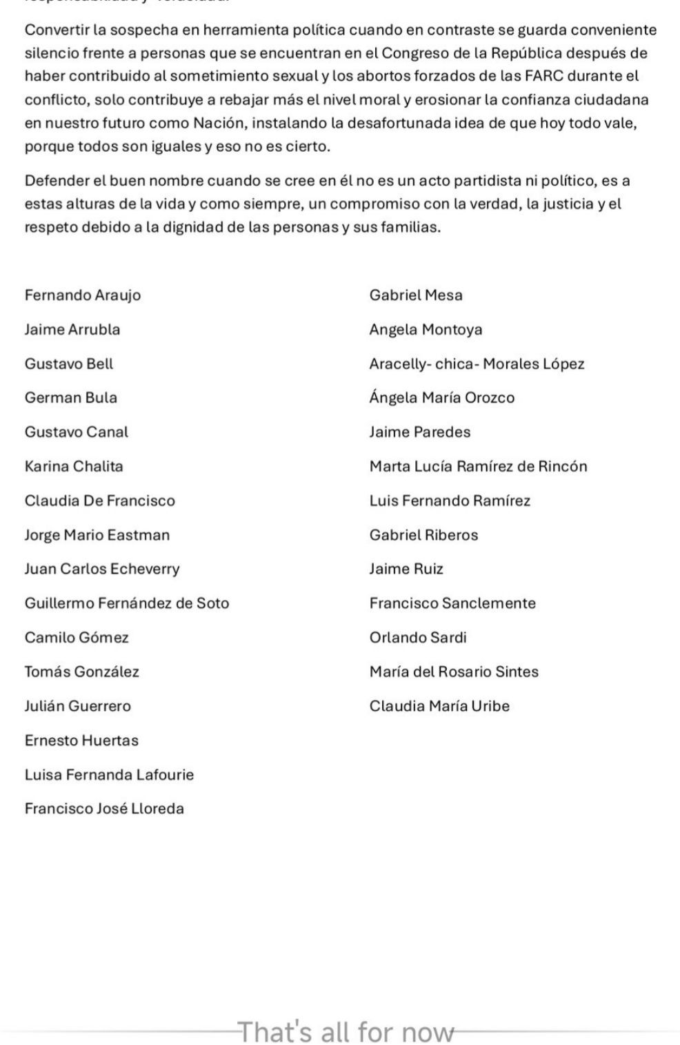 El documento concluye afirmando que defender el buen nombre de Pastrana no responde a intereses partidistas, sino a un compromiso con la verdad y el respeto a la dignidad.