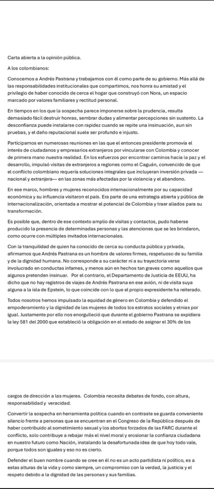 En el documento, los firmantes aseguran que conocen de manera directa la trayectoria pública y privada de Pastrana y rechazan que se pretenda vincularlo, incluso de forma insinuada, con hechos ilícitos.