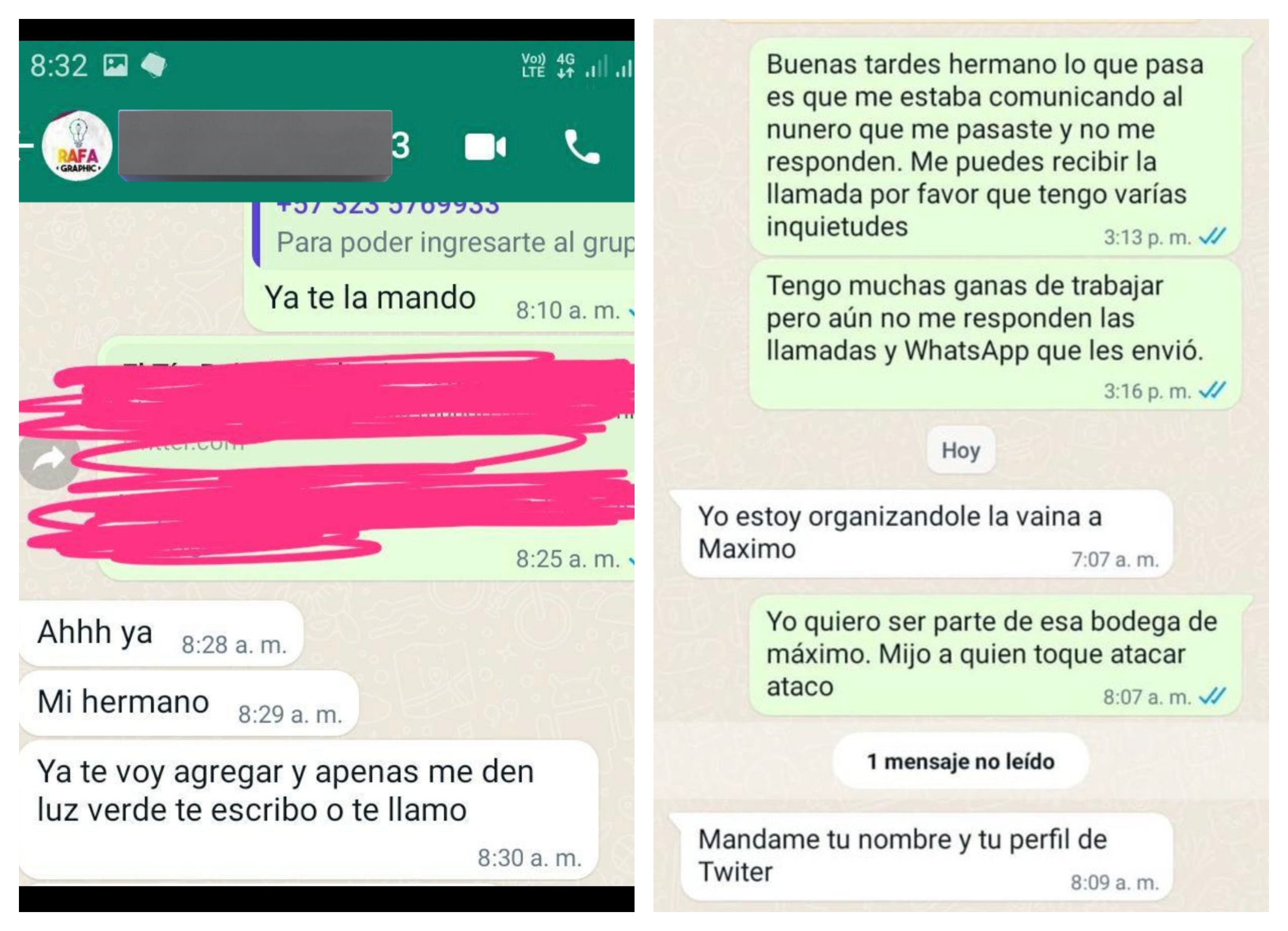 A primera hora, presentó un video y varios pantallazos de WhatsApp. En estos se ve un número identificado como Rafael. Un sujeto le escribe pidiéndole información sobre el trabajo que hay que realizar en Twitter.