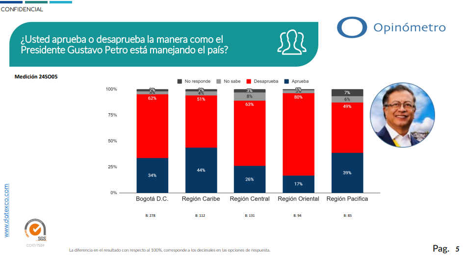 La percepción regional revela que la región oriental lidera en desaprobación con un 80%, seguida por las regiones central y Bogotá, con cifras de 63% y 62%, respectivamente. Estas disparidades geográficas indican desafíos significativos para el presidente Petro en distintas áreas del país.