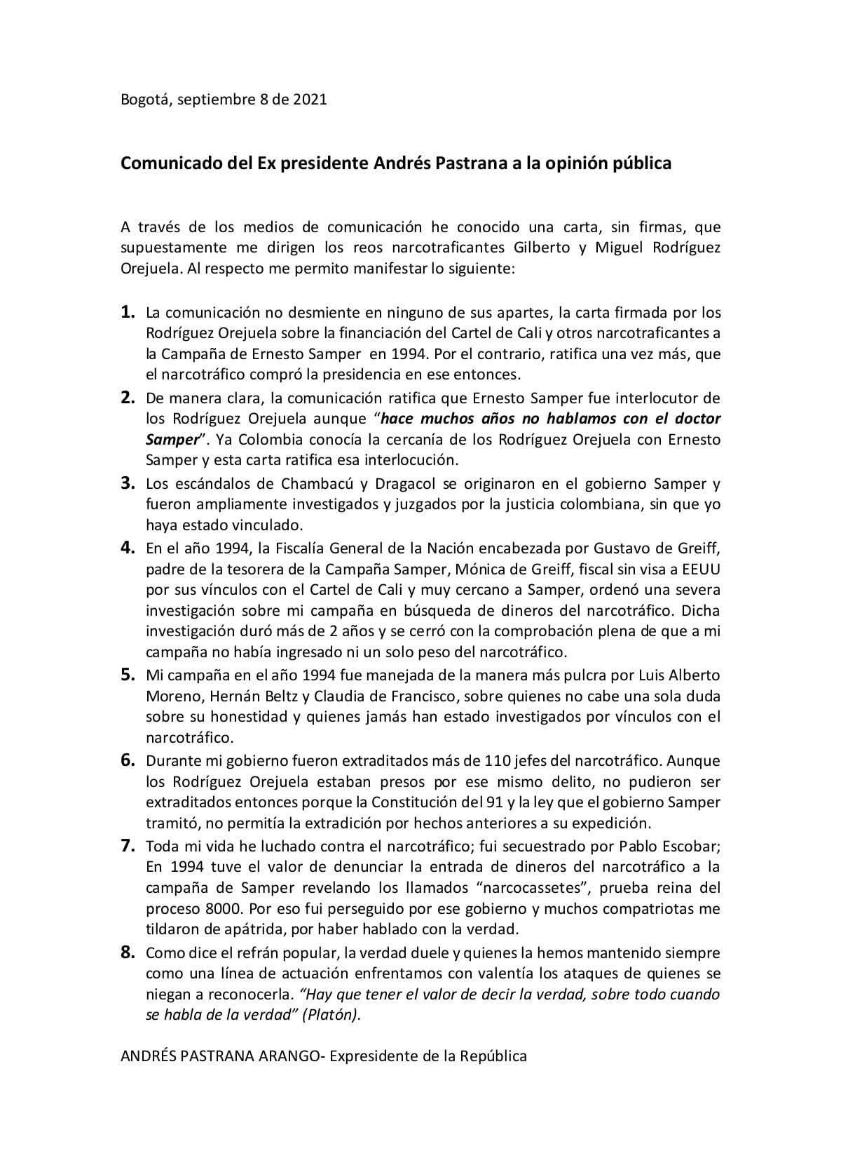 Cabe resaltar que los Rodríguez Orejuela también expresaron que aportaron financiación a la campaña de Pastrana. Por eso, el exmandatario respondió por medio de un comunicado: