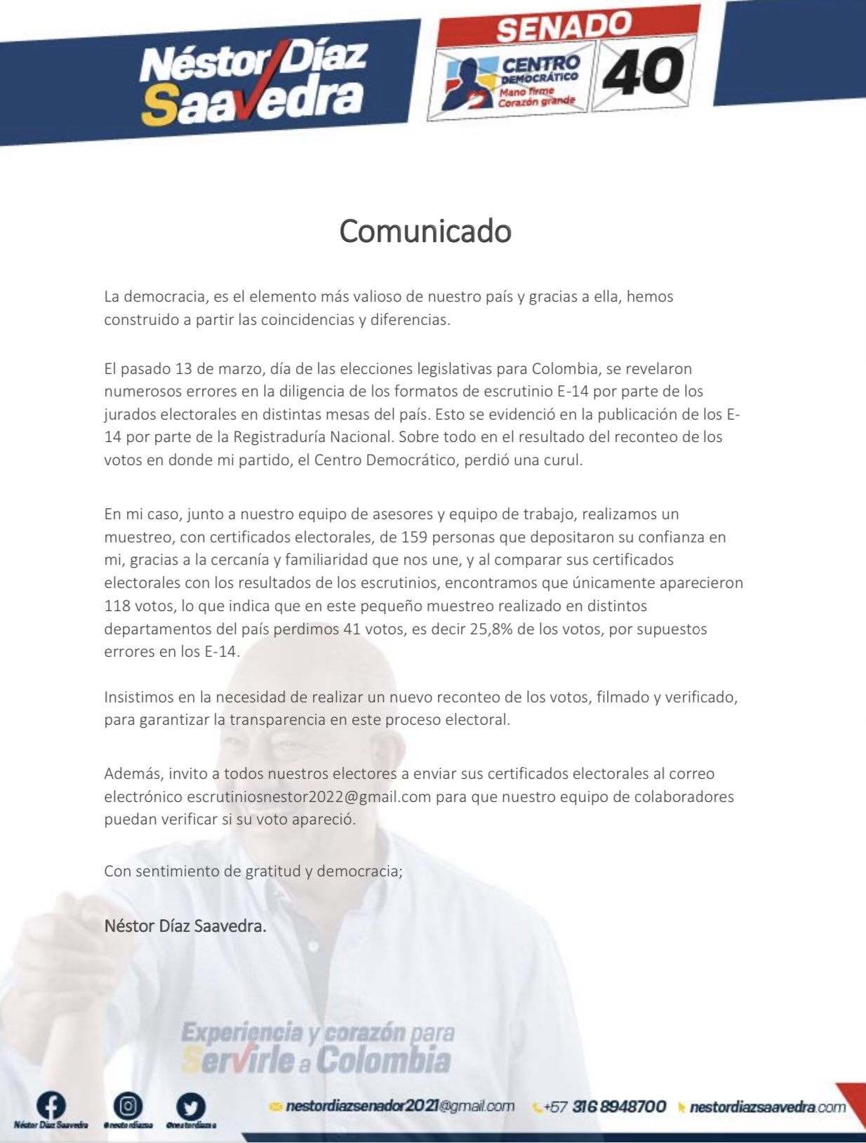 Entre tanto, Néstor Díaz candidato al Senado por el Centro Democrático dio a conocer que solo encontraron 118 votos luego de conocer un muestreo con certificaciones electorales de 159 personas. “Lo que indica que en este pequeño muestreo realizado en distintos departamentos del país perdimos 41 votos, es decir 25,8% de los votos”.