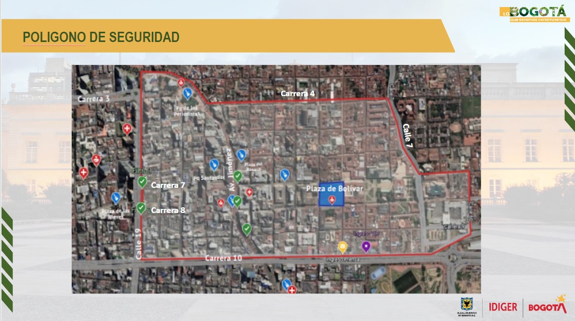 De acuerdo con el director del Sistema Distrital de Gestión de Riesgos y Cambio Climático (IDIGER), se desplegará un polígono de seguridad que contará con más de 10 mil uniformados repartidos en los diferentes puntos de encuentro de Bogotá. En cuanto a la movilidad, desde la calle 19 y 7 entre carreras 4 y 10 habrán restricciones.