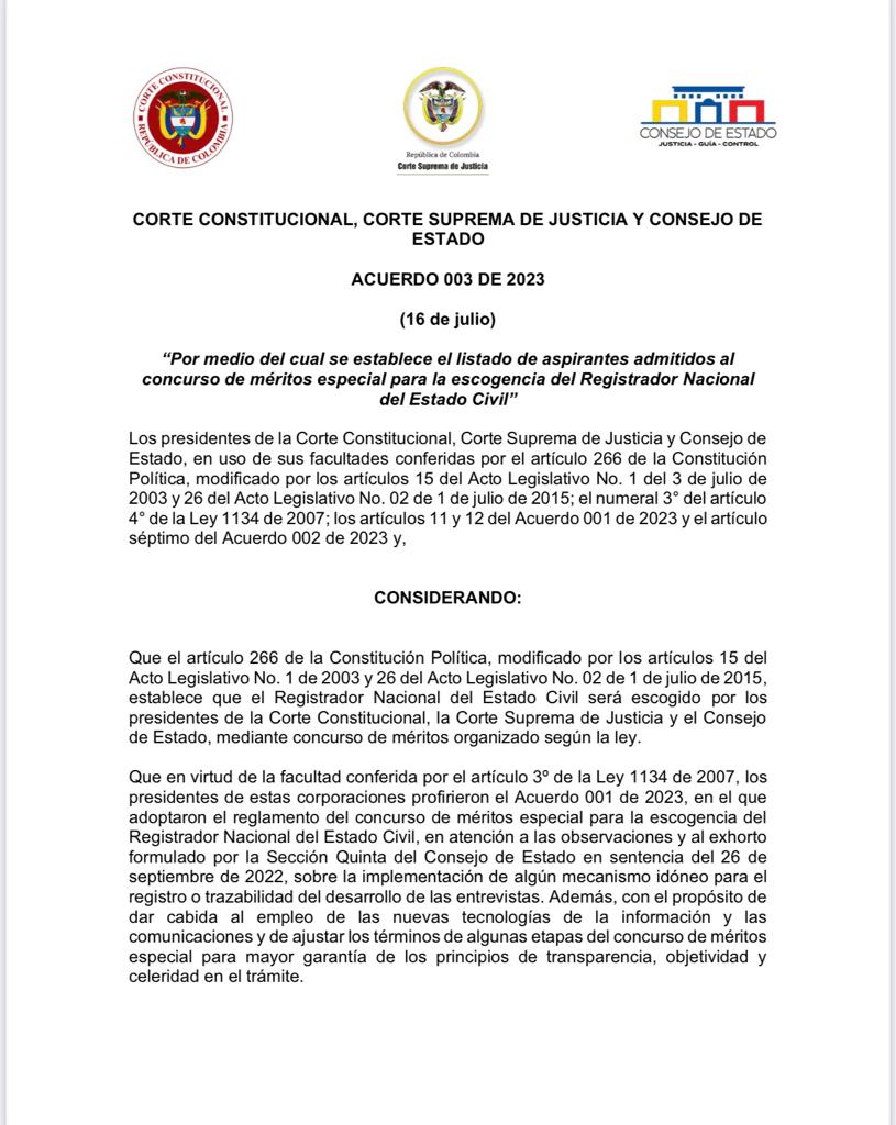 Mediante la expedición del Acuerdo 004 de 2023, los presidentes de la Corte Constitucional, Consejo de Estado y Corte Suprema de Justicia, los magistrados Diana Fajardo, Jaime Rodríguez y Fernando Castillo, inadmitieron a 97 aspirantes que se habían inscrito en el concurso de méritos con la finalidad de ocupar el cargo de Registrador Nacional.