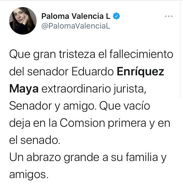 “Debo informarle a la Comisión Primera del Senado una lamentable noticia que acaban de confirmar. Nuestro compañero de Comisión, expresidente de este periodo de la Comisión, Eduardo Enríquez Maya, ha fallecido. Perdemos un gran compañero, un gran jurista, un gran congresista. Quiero expresar en nombre de toda la Comisión nuestro saludo fraterno, solidario, de condolencias”, informó el senador Miguel Ángel Pinto.