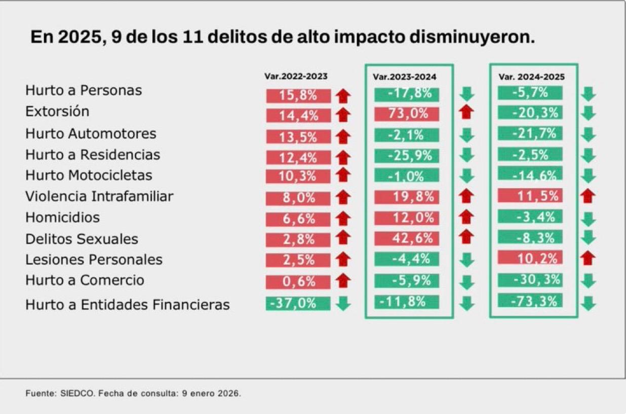 Los delitos que disminuyeron en 2025 fueron: hurto a personas (-5,7 %), a comercio (-30,3 %), a residencias (-2,5 %), a entidades financieras (-73,3 %), a automotores (-21,7 %) y a motocicletas (-14,6 %). Además del homicidio (-3,4 %), extorsión (-20,3 %) y delitos sexuales (-8,3 %).