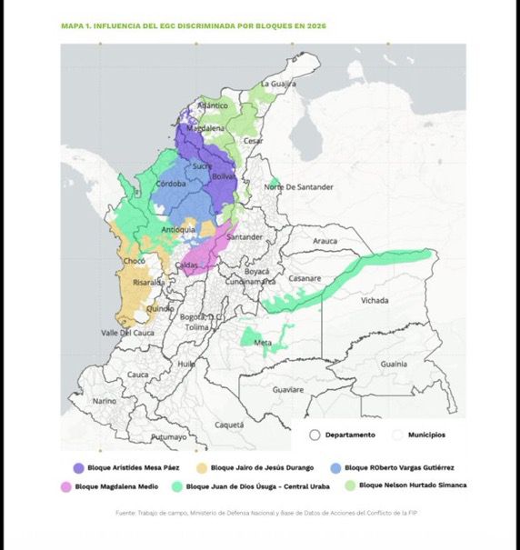 La FIP detalla además que el Clan del Golfo opera actualmente mediante seis bloques que distribuyen responsabilidades militares, logísticas y económicas: