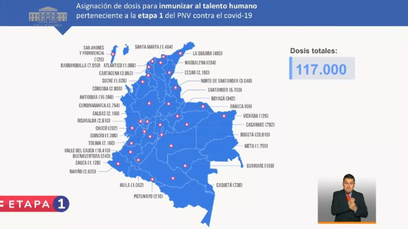 La distribución se realizará en todos los departamentos del país según la cantidad de talento humano en salud en primera línea que reste por vacunar. De esta forma, Antioquia recibirá 15.060 dosis; Atlántico 1.068, Barranquilla 7.900, Bogotá 39.918, Cartagena 3.852, Caldas 2.160, Córdoba 2.808 y Cundinamarca 2.754.
