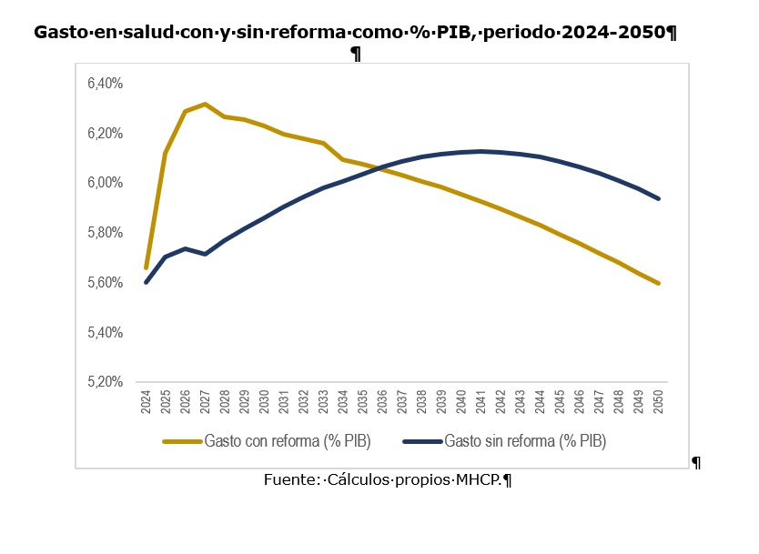 La siguiente gráfica compara el gasto en salud hasta 2050 en un escenario con y sin reforma. Como se observa, aunque durante los primeros años el gasto del escenario con reforma es superior, esta situación se invierte a partir de la vigencia 2036.