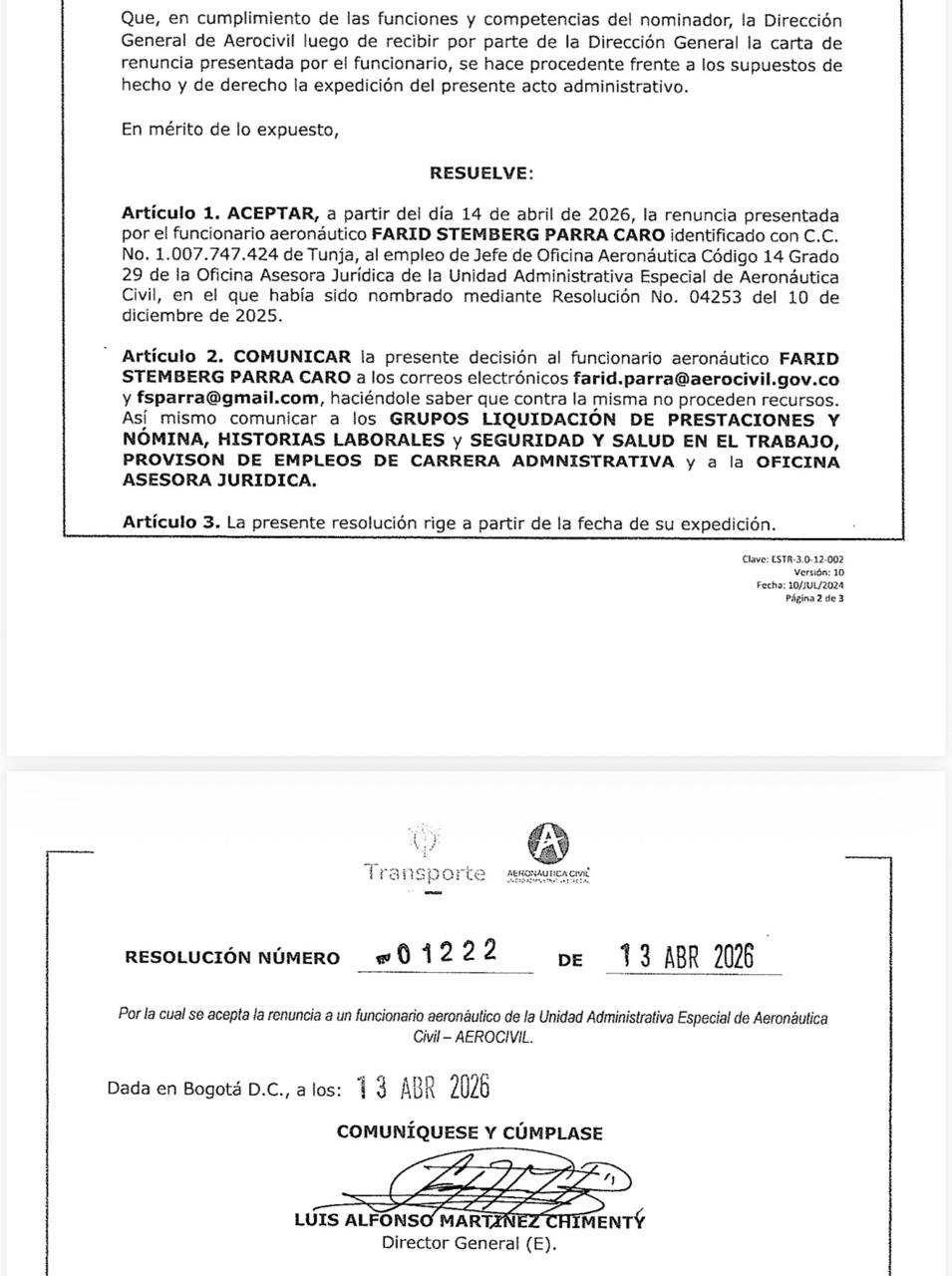 Farid Parra Caro, jefe jurídico de la Aerocivil, cargo clave, renunció a su cargo en medio de presiones para favorecer al denominado clan Torres que se asegura manda en la entidad.