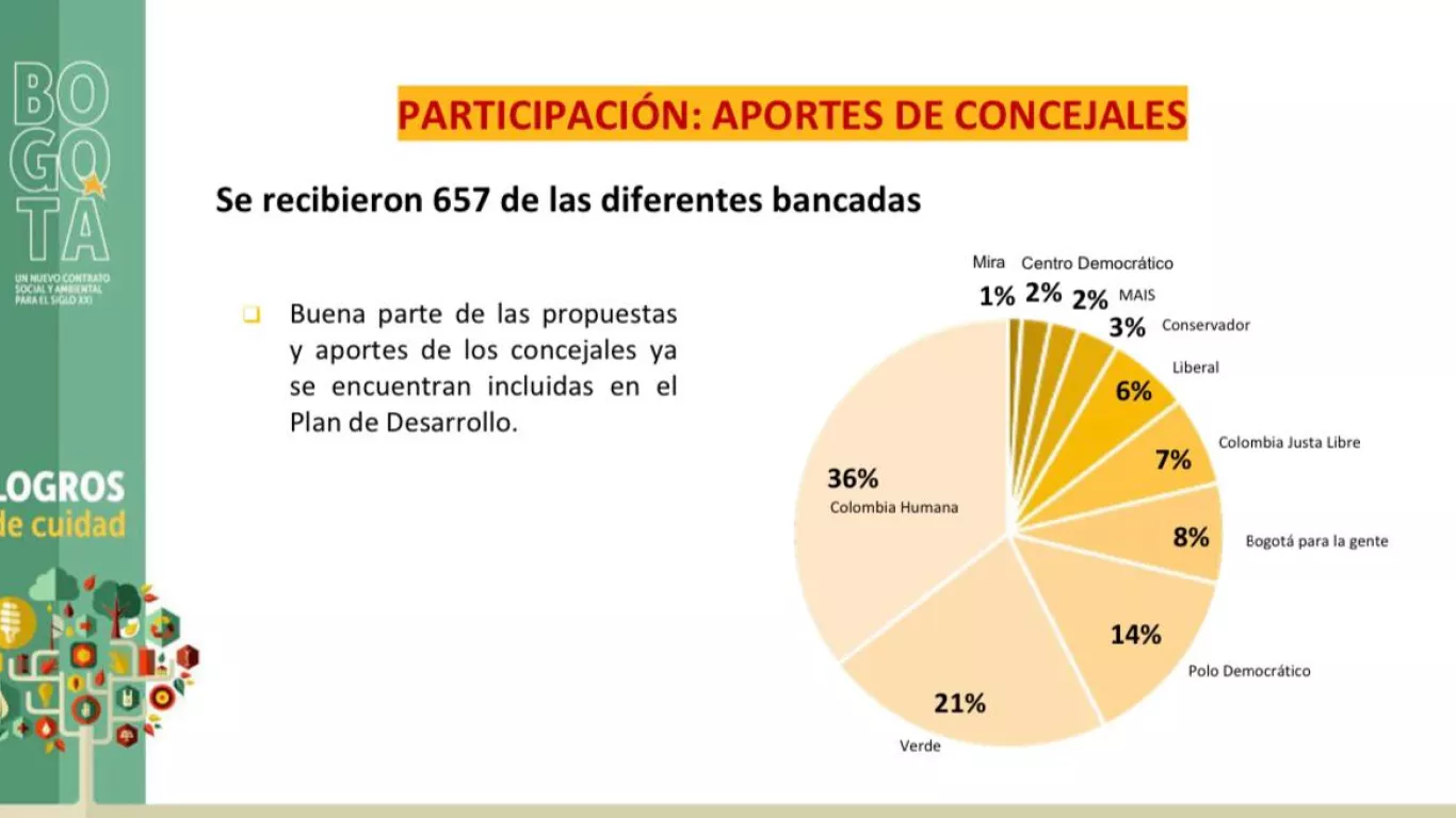 Este sábado, la alcaldesa Claudia López presentó al Concejo de Bogotá el Plan de Desarrollo 2020-2023 mediante un documento de 92 páginas. Revisando la presentación de la mandataria, causó interés que los mayores aportes conceptuales con un 36%, corresponden a Colombia Humana que lidera el senador Gustavo Petro.